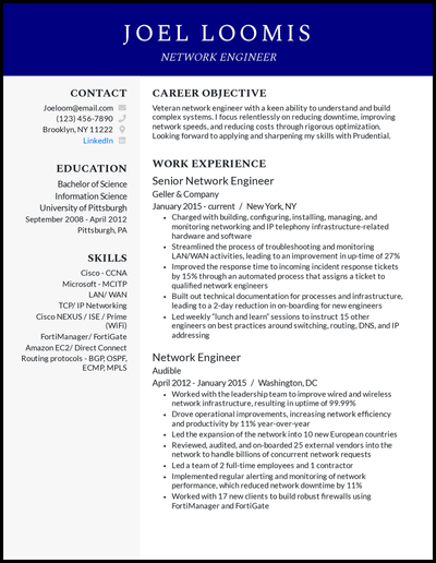 A great resume example for a network engineer. Stand out from the competition. After reading your objective the hiring manager should have a basic understanding.